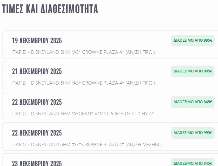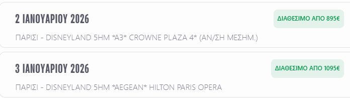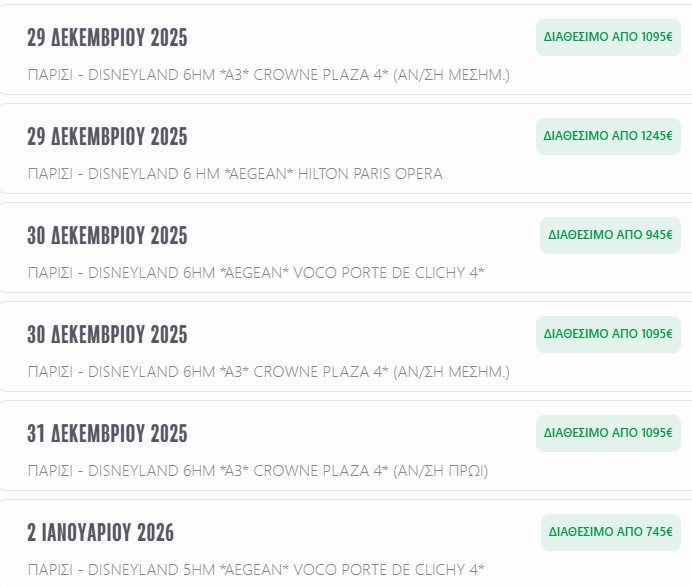 Απολαύστε τις Χριστουγεννιάτικες γιορτές στο Παρίσι. Η πόλη σας αποκαλύπτει τους μεγάλους οίκους μόδας, τις μπουτίκ κορυφαίων Γάλλων σχεδιαστών, τα αρώματα και τα καλλυντικά, τα καφέ και τα μπιστρό, τη ρομαντική και ερωτική ατμόσφαιρα, τα διάσημα καμπαρέ, την όπερα, τα υπέροχα μουσεία και τις εξαιρετικές πινακοθήκες. Πάντα το καλύτερο Παρίσι που μπορείτε να δείτε, προσθέτοντας και μια ξεχωριστή νότα, τη μαγεία της Disneyland. Ταξιδέψτε με τους πειρατές της Καραϊβικής ή τον Ιντιάνα Τζόουνς στη «Χώρα της Περιπέτειας», χαθείτε στο άπειρο με ένα διαστημόπλοιο στο «Βουνό του Διαστήματος», συναντήστε τον Μίκυ, τον Ντόναλντ, τον Πινόκιο, τη Χιονάτη και τους Εφτά νάνους στη «Χώρα της Φαντασίας», απολαύστε υπέροχα θεάματα και σόου που κόβουν την ανάσα. Οι έμπειροι αρχηγοί μας με τις προτάσεις τους θα σας βοηθήσουν να αποκομίσετε τις καλύτερες εμπειρίες.