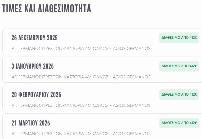 Νιώστε τη μαγεία της φύσης στα φυσικά σύνορα της χώρας μας, τη Μικρή και Μεγάλη Πρέσπα, με τον Άγιο Γερμανό και τους Ψαράδες, τον ακριτικό επίγειο παράδεισο γαλήνης και ηρεμίας, που κάποια στιγμή ο καθένας αξίζει να αναζητήσει.  Χαλαρώστε με δραστηριότητες στη φύση, γνωρίστε τα βυζαντινά μνημεία και τα ασκηταριά της λίμνης και απολαύστε μοναδικά τοπικά προϊόντα. Το ταξίδι αποκτά μεγαλύτερη αξία με μια περιήγηση στη γραφική παλιά πόλη της Καστοριάς, το Ντολτσό, αλλά και με μια επίσκεψη στο Νυμφαίο, ένα από τα πιο όμορφα χωριά της Ελλάδας.