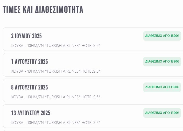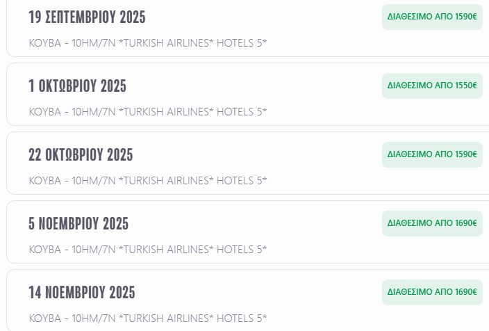 Κούβα… ένα κόσμημα στην θάλασσα της Καραϊβικής, μια χώρα με πλούσια ιστορία, φυσική ομορφιά, υπέροχες παραλίες και αυθεντικούς, απλούς και φιλόξενους ανθρώπους. Η μουσική και ο χορός κυριαρχούν παντού. Η γενική ατμόσφαιρα της χώρας μας μεταφέρει στη δεκαετία του 1960, μας το θυμίζουν άλλωστε και τα αυτοκίνητα-αντίκες που κυκλοφορούν ακόμα στους δρόμους της. Ένας προορισμός ιδιαίτερος και μοναδικός στον κόσμο σας περιμένει και εμείς γνωρίζουμε τον καλύτερο τρόπο για να σας δείξουμε όλες του τις ομορφιές.