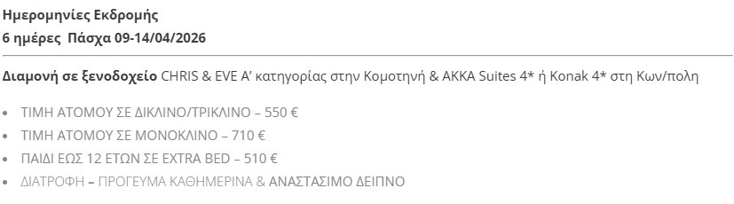 - Μεταφορές , εκδρομές/ξεναγήσεις όπως αναφέρονται στο πρόγραμμα με πολυτελές πούλμαν και ελληνόφωνο ξεναγό.