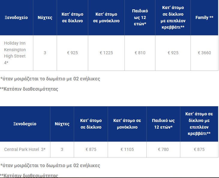 - Τρεις διανυκτερεύσεις στο ξενοδοχείο HOLIDAY INN KENSINGTON HIGH STREET 4* ή CENTRAL PARK HOTEL 3* ανάλογα με την επιλογή σας.