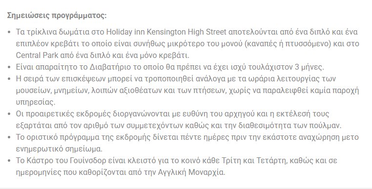- Είσοδοι σε μουσεία – θεάματα, φιλοδωρήματα, ποτά, αχθοφορικά και ότι είναι προαιρετικό ή προτεινόμενο και δεν περιλαμβάνεται στα πιο πάνω προσφερόμενα.