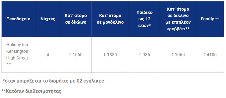 - Τρεις διανυκτερεύσεις στο ξενοδοχείο HOLIDAY INN KENSINGTON HIGH STREET 4* ή CENTRAL PARK HOTEL 3* ανάλογα με την επιλογή σας.
