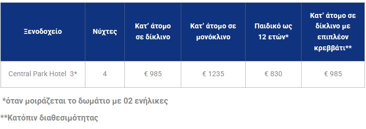 - Είσοδοι σε μουσεία – θεάματα, φιλοδωρήματα, ποτά, αχθοφορικά και ότι είναι προαιρετικό ή προτεινόμενο και δεν περιλαμβάνεται στα πιο πάνω προσφερόμενα.