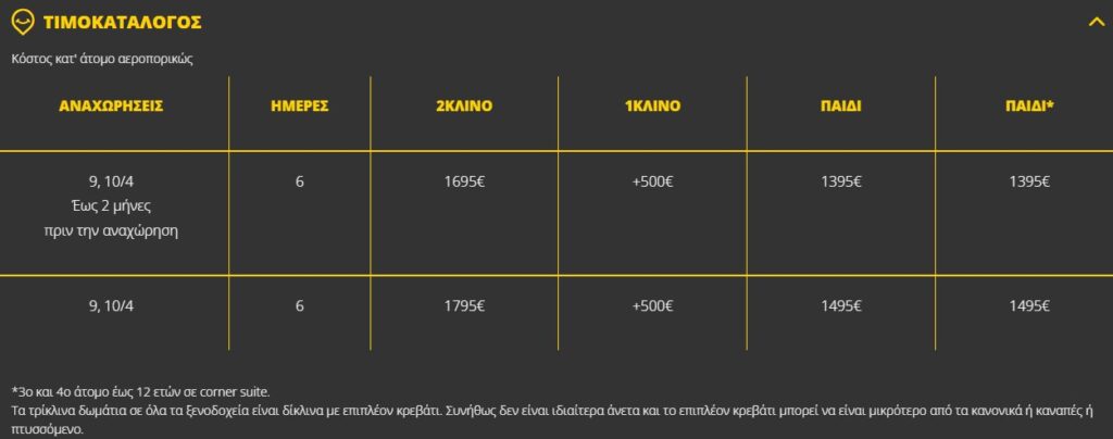 • Οι παιδικές τιμές ισχύουν για διαμονή παιδιού (έως 12ετών) στο ίδιο δωμάτιο με 2 ενήλικες, σε πρόσθετη κλίνη εκτός εξαιρέσεων.