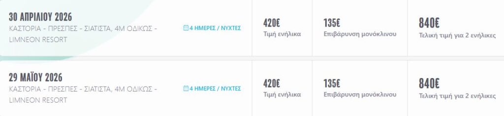 4 μέρες με πούλμαν στην Καστοριά – Πρέσπες – Σπήλαιο Καστοριάς – Ντολτσό – Σιάτιστα. Διαμονή στο πολυτελές ξενοδοχείο LIMNEON RESORT & SPA 5* Deluxe στην Καστοριά με ημιδιατροφή.