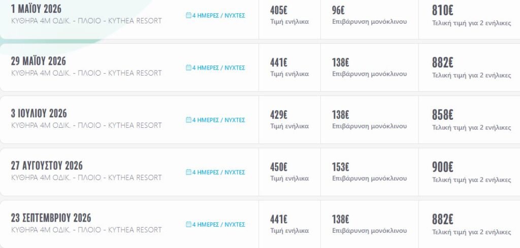 «Τα Κύθηρα ποτέ δεν θα τα βρούμε» έλεγε ένα γνωστό τραγούδι, υποννοώντας ότι αποτελούν την περιοχή της ευτυχίας. Όχι μόνο τα έχουμε βρει, αλλά τα έχουμε εξερευνήσει σπιθαμή προς σπιθαμή για να σας προσφέρουμε τις καλύτερες διακοπές σε αυτή την ιδιαίτερη γωνιά της πατρίδας μας. Με πολυτελή διαμονή στο στο μοναδικό KYTHEA RESORT 4* θα εξορμήσουμε μαζί να γνωρίσουμε καταρράκτες, γοητευτικές εκκλησίες κατάφυτα τοπία, υπέροχες παραλίες και πανέμορφα παραδοσιακά χωριά, όπως η Χώρα, το Καψάλι, το Λιβάδι,ο Μυλοπόταμος, τα Μητάτα, η Αγία Πελαγία και ο Αβλέμονας.
