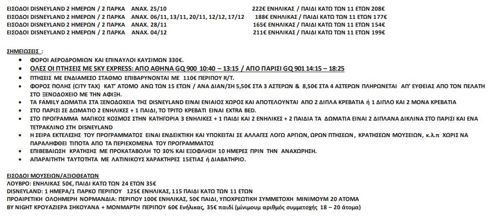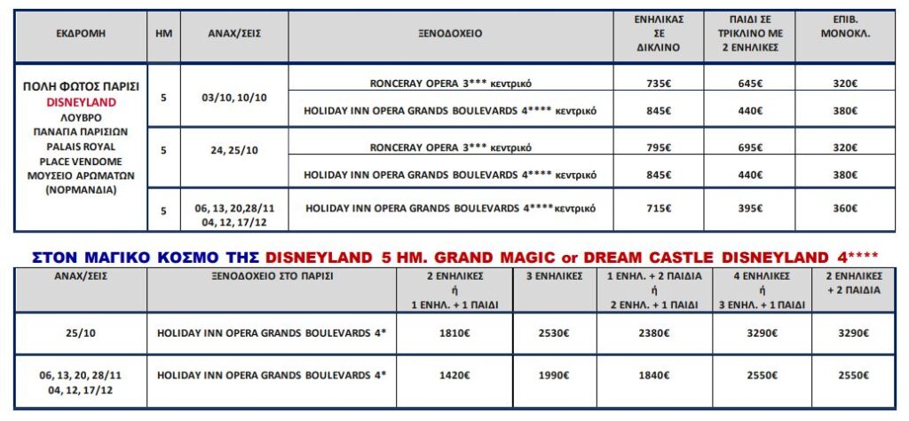 - Εισόδους Λούβρου(Ενήλικες 50€, παιδιά 35€, Ακουστικά) (Disneyland 125€ Ενήλικας & 115€ παιδί κάτω των 11 ετών)