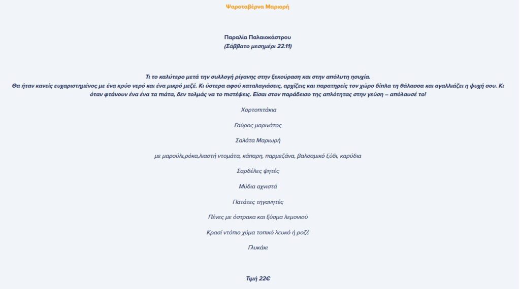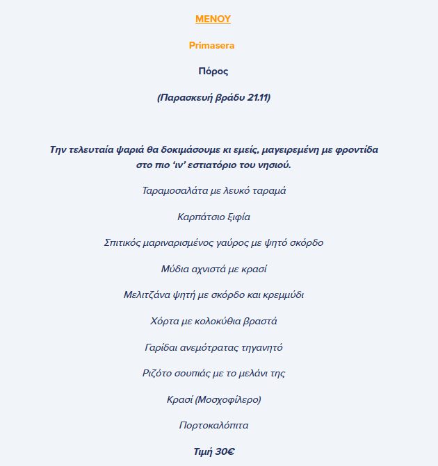 - Γεύματα: Τρία (3) επιλεγμένα γεύματα που προτείνονται όμως σε ειδικές τιμές.