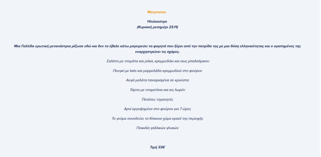 Η μεγάλη έκπληξη μας περιμένει όμως στο ορεινό χωριό Ηλιόκαστρο όπου μια Γαλλίδα ερωτική μετανάστρια, μαγειρεύει ‘θεϊκά’ στο εστιατόριο Maryvonne. Φυσικά εμείς θα είμαστε εκεί για να απολαύσουμε την ελληνογαλλική συμμαχία.